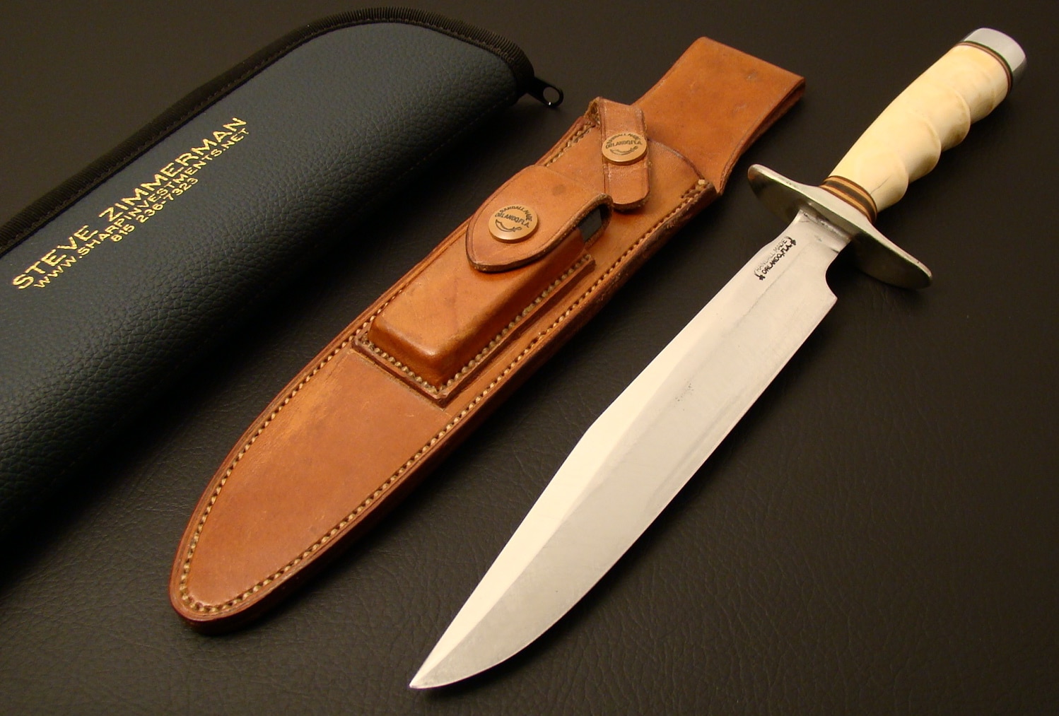 I have another fantastic Randall Model # 1 for sale that has some very collectable features. The carbon steel blade measures 8″ in length and a very wide 1 1/4″ in width. The knife has the original owner’s name etched on the blade ( JOHN L. FULLER ). The blade has been sharpened with sharpening scratches on both sides and only one minor carbon spot which is normal with a vintage blade. The knife is fitted with a double nickel silver hilt which was/is still an option today. The handle has seven spacers separating the hilt from the handle. The handle is made from ivory which has optional finger grips and a duralumin butt cap which was an option as well. The butt cap has a stainless nut to finish off the handle. The ivory does have two inclusions which is typical of exotic material. The knife comes with an excellent Heiser sheath that is stamped on the rear with the Heiser logo and 1 – 8. The stitching is tight and the snaps function perfectly. The sheath houses a Norton combination “boxed” stone. If Your looking to add a very rare and collectable Randall Knife to Your fighting knife collection this is a great piece, as vintage Ivory Fighters are few and far between. Thanks for Viewing, Steve Zimmerman..