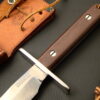 SOLD – I have for sale a very early Randall Model # 19 (Astro) that was most likely one of the first Astros that were made around 1960 – 1961. The knife has a 5 1/2″ carbon steel blade which retains the original Randall grind and finish. The blade has some staining and pitting on the blade. The pitting is only located on the non-logo side of the blade. The nickel silver hilt is extremely wide @ 3 5/16″ in width. The handle scales are made of very desirable brown micarta and held in place with two thru bolts. The leather wrist thong is original to the knife and correct for this period. The knife comes with an excellent Johnson roughback (splitback) model “C” sheath. The rivets and snaps are all intact The sheath houses a yellow print Combination Crystolon stone that is unused. It is very difficult to locate these early Astros with brown micarta as most of these knives were put to hard use and discarded over the last 50 years. Thanks for viewing, Steve Zimmerman.